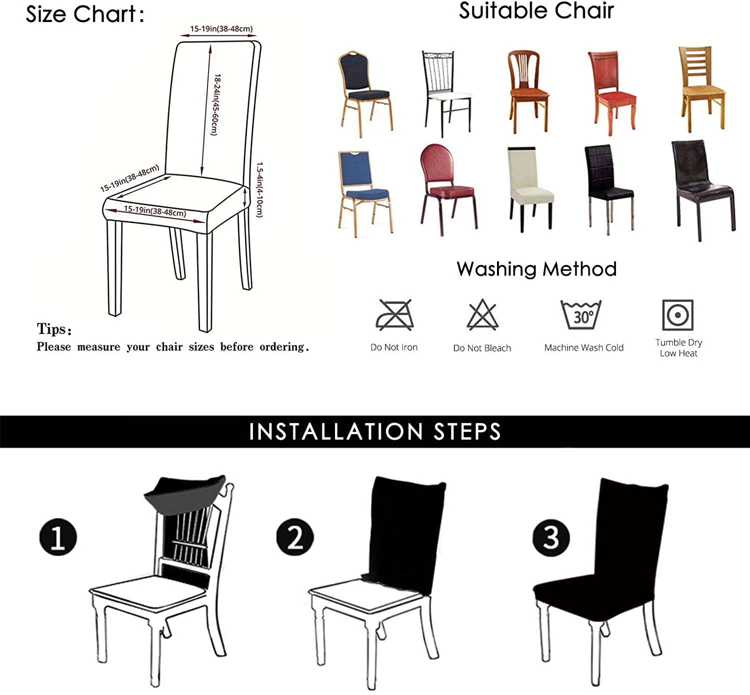 【Premium Dining Chair Slipcovers】Made of high quality polyester and spandex material featuring two-way high stretchy, comfortable and wrinkle resistant, no ironing required; dining chair covers secure fit with sewn-in elastic hem; Machine washable, easy to clean