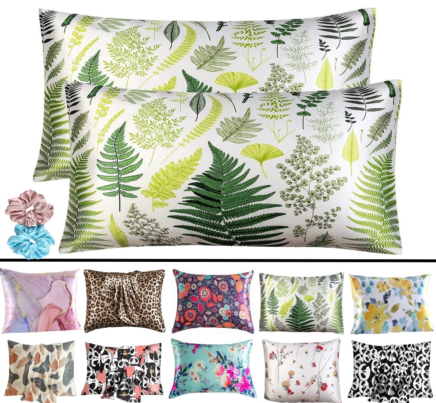 Pillow Cover, Silk Pillowcase for Hair and Skin, Soft Breathable Smooth Both Sided Natural Silk 2 Pillow Covers with Envelope Closure,Stylish 2 Scrunchies for Women