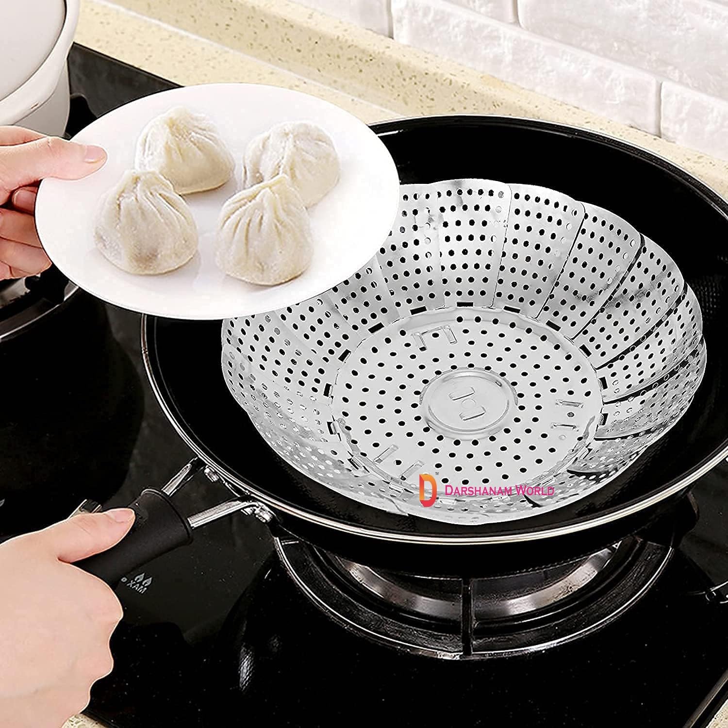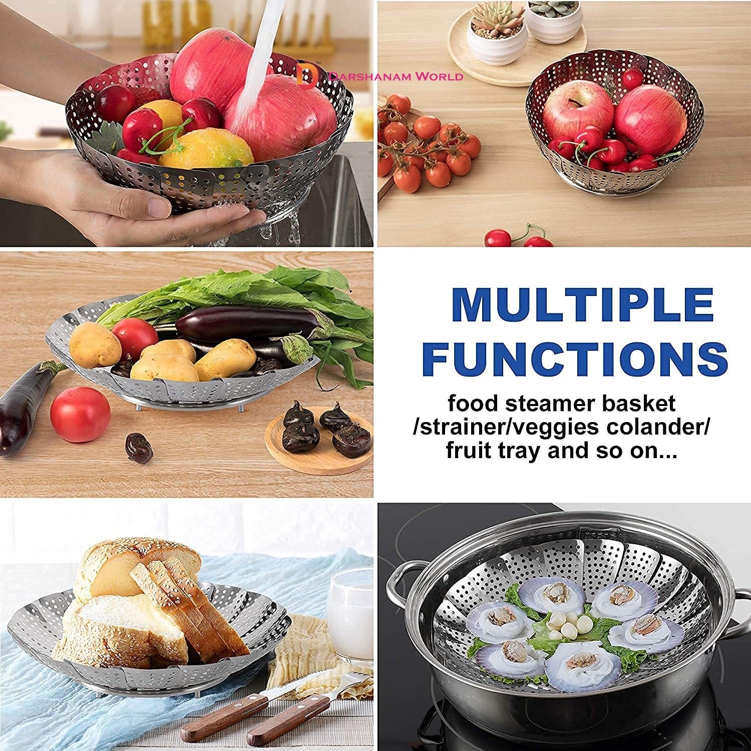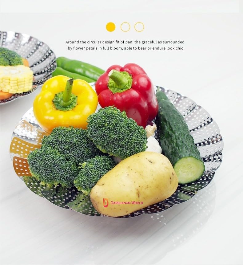 DARSHANAM WORLD Kitchen Vegetable Steamer, Stainless Steel Vegetable Steamer Punching Food Drain Bowl Basket Steamer, Momos Steam Basket Foldable Veg Steamer For Cooking To Fits Various Size Pot.