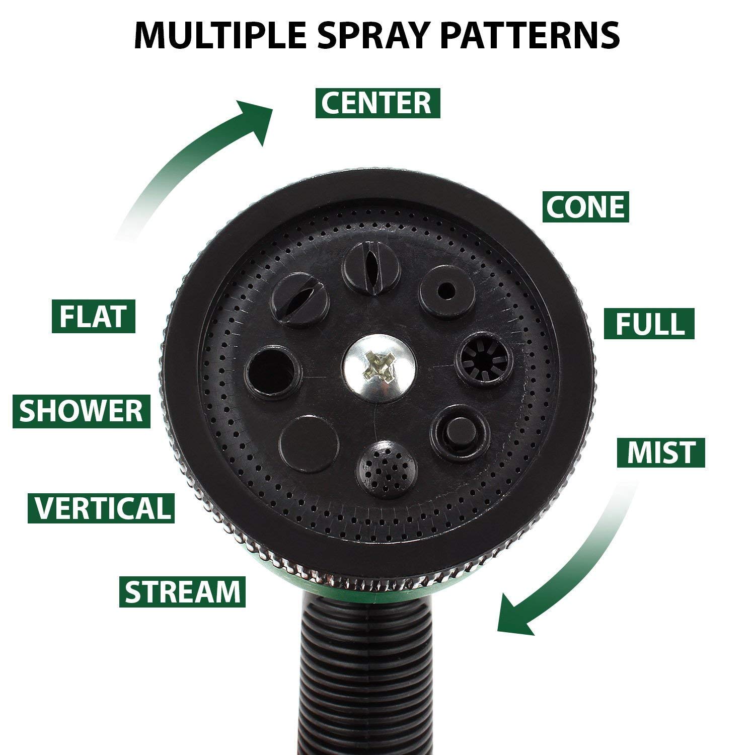 8 WATERING PATTERNS – Choose from Flat, Center, Cone, Rinse, Shower, Mist, Soaker, and Jet to cover all of your watering needs! In addition, adjustable flow control expands your options even more so you can handle any watering task you encounter!